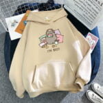 This hoodie is not only adorable, but also cozy and comfortable. It features a soft, pink/khaki fabric and a cute cartoon character on the front. The character is a cat with a coffee cup and a laptop, showing how busy and productive you are. The words “I’m Busy” are written below the character, adding a touch of humor and sass.